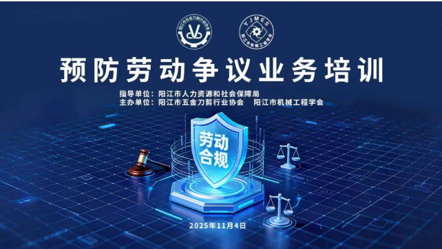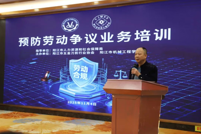 近年来,企业劳资社保工伤等纠纷案件不断增多,严重影响企业正常生产和社会稳定,为进一步增强会员企业法律意识,降低会员企业的风险及损失,推动企业高质量发展,2025年11月 4日,在阳江市人力资源和社会保障局的支持下,协会联合阳江市机械工程学会举办预防劳动争议业务培训,阳江市人力资源和社会保障局四级调研员黄国治和调解仲裁管理科科长朱启童以及115家会员企业180人参加了培训。