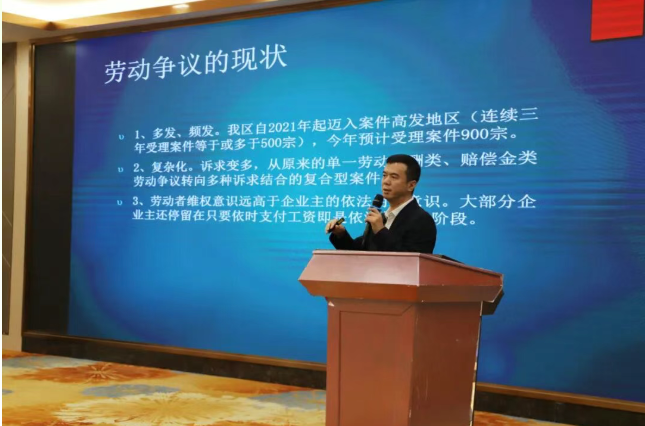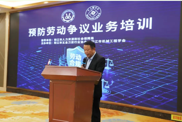 培训班由阳江市江城区劳动人事争议调解仲裁委员会办公室主任赖定彬主讲,他是处理劳动争议案件的专家,近年共参与处理各类劳动争议案件超过2000宗,是2012年广东省优秀仲裁员、2015年广东省劳动模范,2024年获得广东省人社厅、省总工会、省工商联、省企联联合通报表彰工作表现突出仲裁员;2019年攥写的裁决书入选省仲裁院仲裁裁决书范文。本次,赖定彬作了《如何预防劳动争议》的专题授课,用生动的案例深入浅出地阐释了劳动争议的相关政策法规,讲授如何预防劳资社保工伤等劳动争议,给会员企业相关负责同志上了深刻的一课。