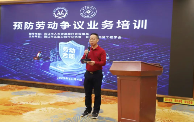 近年来,企业劳资社保工伤等纠纷案件不断增多,严重影响企业正常生产和社会稳定,为进一步增强会员企业法律意识,降低会员企业的风险及损失,推动企业高质量发展,2025年11月 4日,在阳江市人力资源和社会保障局的支持下,协会联合阳江市机械工程学会举办预防劳动争议业务培训,阳江市人力资源和社会保障局四级调研员黄国治和调解仲裁管理科科长朱启童以及115家会员企业180人参加了培训。